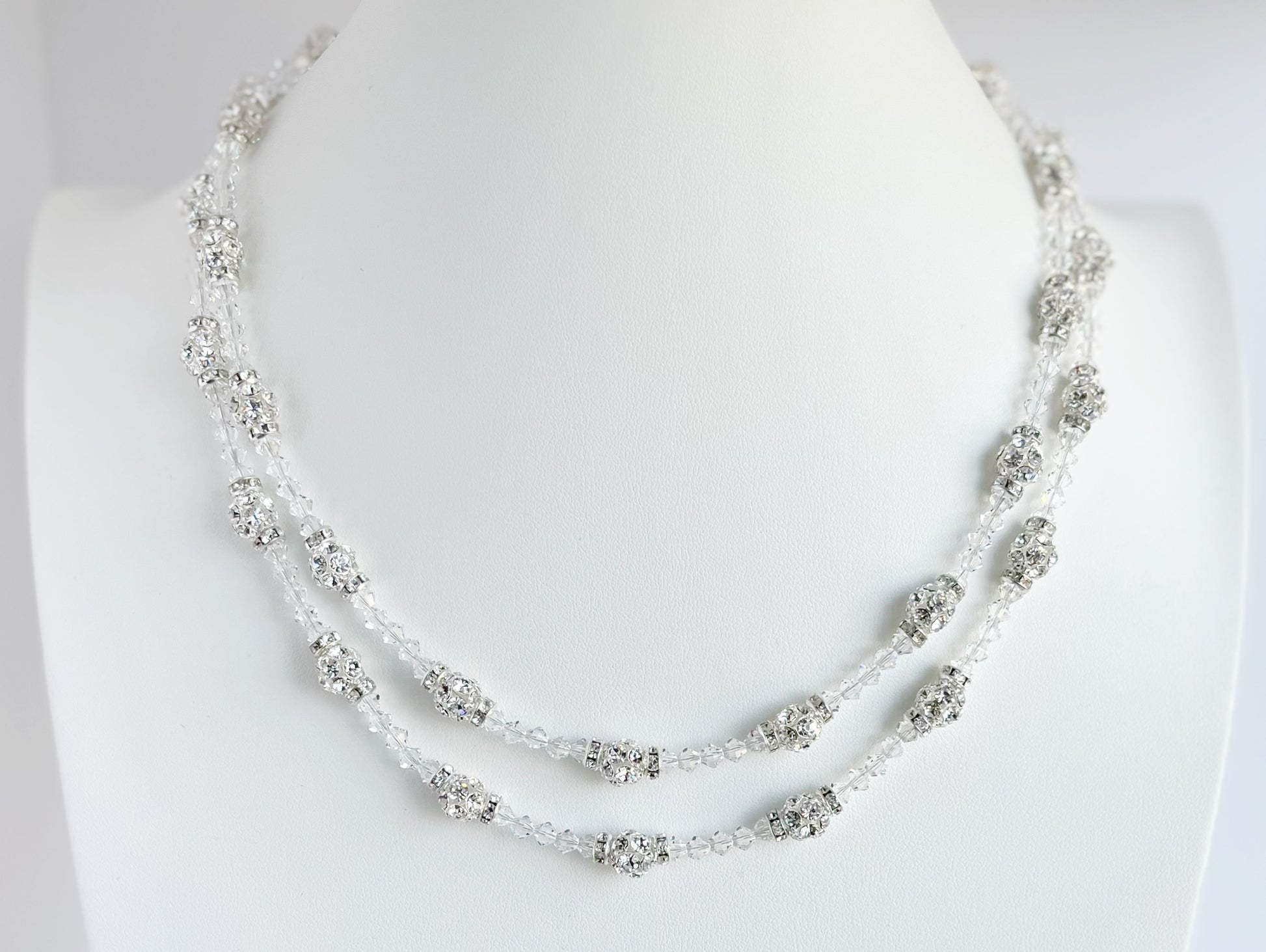 Materials: sterling silver pavé crystal rounds, clear Austrian crystals & cz magnetic clasp with rhodium plated/finished