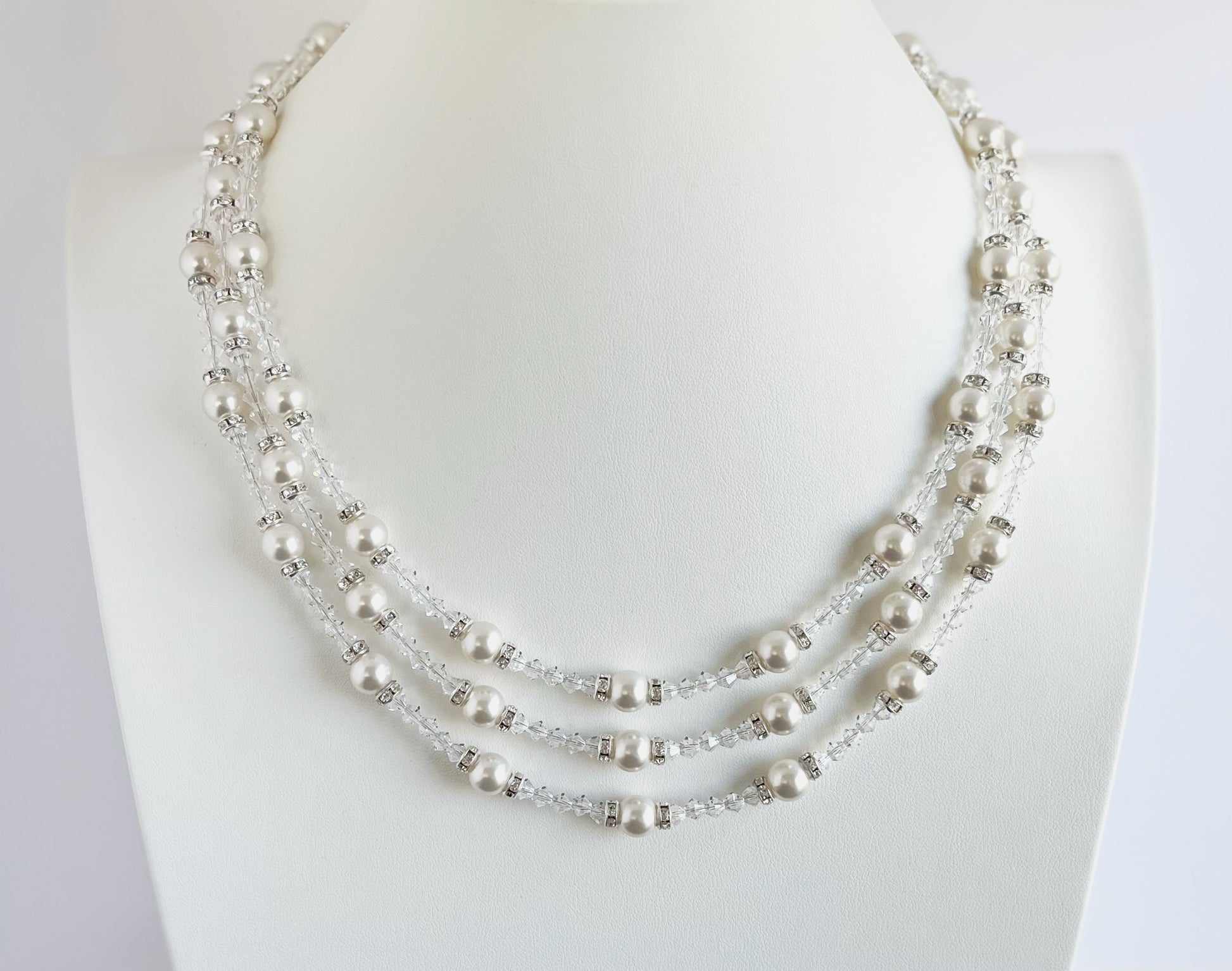 Materials: sterling silver crystal rhondelles, Austrian clear crystals, crystal pearls & cz magnetic clasp with rhodium plated/finished